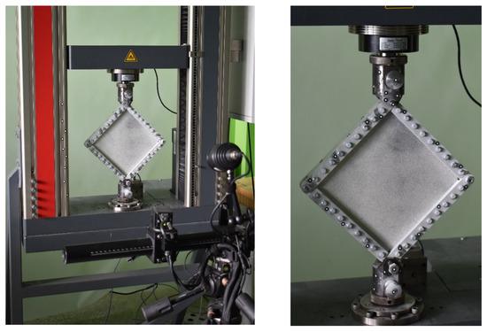 The experiment was conducted using a special device consisting of four double steel beams, which were articulated at the corners (Figure 6). The edges of the plate were fixed between the beam stiffeners with bolted connections. Two opposite corners of the device were connected to knots fixed in the jaws of the testing machine.