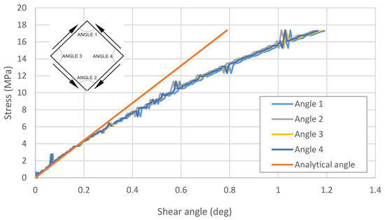 Relationship between the measured values of the shear strain angles and the value of the stress in the plate. The analytical angle was designated based on the value presented in Figure 9.