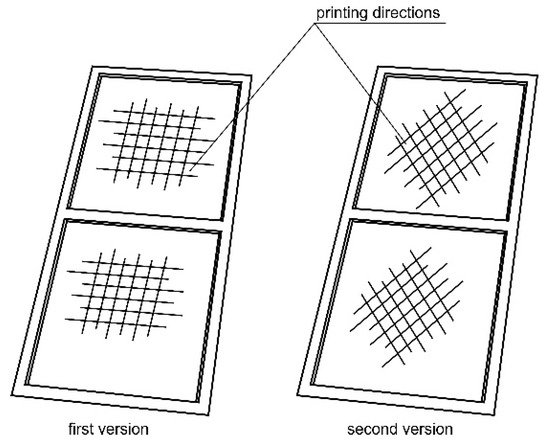 The wall of the torsion box was modeled in the 3D CAD software CATIA v5 (Dassault Systèmes, Vélizy-Villacoublay, France) and was made using the 3D printing technique, in the form of a thin plate with integral reinforcements in the areas of the intended bolted connections (Figure 11). Two versions of the wall model were made with different printing directions. The areas of smaller thickness in both cases were made of two layers with mutually perpendicular directions for the material application. In the first model, these directions corresponded to the directions of the wall edges, while in the second model they were oriented in relation to them at an angle of 45 degrees (Figure 12).