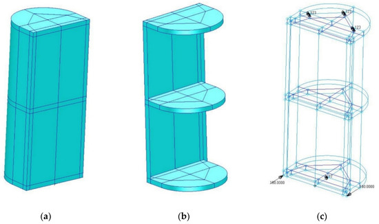 FEM geometric model: (a) general view; (b) model with a partially hidden shell; (c) model with visible edge conditions and loading.