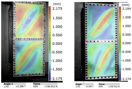 On the other hand, the shear strain angle was determined based on the measurements with the Aramis optical scanner. During the experiment, the relationship between the values of the angles between the plate’s edges and the value of the stress was determined (Figure 8).