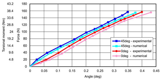 The validity of the thesis regarding the necessity to use the above-described method of numerical modeling for printed structures was confirmed by the results of experiments using the torsion box model with a wall made of polylactide. It should be emphasized that the nature of the work for both examined structures under the conditions of post-critical loads was very similar, as a result of the appearance of a physical imperfection in the form of a tension field in both wall segments. Therefore, no noticeable differences in the nature of deformation were expected; however, a detailed comparative analysis of the displacement distribution (Figure 17) enabled clear differences to be observed, both in terms of quality and quantity. Nonlinear numerical analyses confirmed this difference, although the values of the calculated displacements were not fully consistent with those determined experimentally. It should be emphasized once again that the conditions of the experiment introduced certain disturbances in the form of initial geometric imperfections, while the numerical model was based on an idealized geometry. Therefore, it was concluded that the determinant of the satisfactory compliance of the numerical calculations with the experiment is the similarity of the representative equilibrium paths, representing the state of the structure as determined by the total angle of its twist and load. As shown in the graph (Figure 18), the discrepancies between the specific characteristics obtained experimentally and numerically were very small. Numerical models showed a slightly lower stiffness than their real equivalents, which may be due to some inaccuracy in the range of determining the physical constants of the material. Some errors could also be introduced with simplified numerical mapping of the edge conditions. Ultimately, however, considering the very slight differences in the course of the above characteristics, the convergence of the results can be regarded as satisfactory.