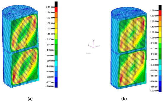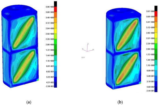 Distributions of displacements in the direction of the Y-axis of the reference system: (a) a wall with a fiber orientation corresponding to the X, Z directions; (b) a wall with fiber orientation at an angle of 45 degrees in relation to the X, Z directions.