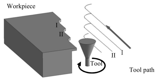A 0.5 mm diameter square end mill made of TiSiN-coated cemented carbide was used as a micro end mill tool. There were two flutes in this tool. A high-precision machining center YMC325 (Yasuda Precision Tools K.K., Okayama, Japan), with a maximum spindle speed of 30,000 min−1, was used for the cutting tests. The cutting force was measured while a workpiece was cut on a high-precision dynamometer 9265C1 (Kistler, Winterthur, Switzerland). The workpiece material was a hardened die steel and a well-known die material (JIS: SKD61) of HRC53 hardness. The interference situation between the workpiece and the tool is described in Figure 1. To simplify the analysis of the cutting phenomena, the side cutting was performed using only the outer peripheral flutes with a 0.1 mm protruding edge. Figure 2 illustrates the cutter location for the experiments in the up cut milling, under the following specific procedure. First, a workpiece was surfaced for use in making measurements for a tool in new condition. Then, the workpiece for producing tool cutting edge wear was cut for a prescribed distance. After that, the workpiece was again cut to fabricate a post-wear reference surface I. Next, the post-wear reference surface I was machined repeatedly until steady-state cutting resulted, thus obtaining the steady-state cutting surface II. Next, the normal and tangential components of cutting force, and , were monitored during steady cutting. Then, the normal and tangential components of was defined as the average cutting force, and , and evaluated. Finally, the surface roughness in the feed direction of the tool was measured on the steady cutting surface using a surface texture measuring instrument SV3100C (Mitutoyo Corp., Kanagawa, Japan). The list of the cutting conditions is given in Table 1. First, the cutting length at which a steady cutting surface is obtained, i.e., the cutting phenomenon at the initial stage of cutting, was evaluated. The cutting length of 0 m means this initial stage of cutting. Up and down cut milling experiments were carried out to investigate the cutting phenomena resulting from the differences in the cutting direction. The experiment with a spindle speed of 10,000 min−1 (cutting speed of 15.7 m/min) was conducted using a machining center spindle, whereas that of 100,000 min−1 (cutting speed of 157 m/min) was completed using a high-speed air-turbine spindle RBX-12 (Big Daishowa Seiki Co., Higashi-Osaka, Japan). Accordingly, RBX-12 had high radial stiffness because of the rolling bearings. In the experiments, the effect of the feed rate f was analyzed by varying the feed speed F at the fixed spindle speed of 100,000 min−1. We conducted experiments in several times depending on the cutting conditions in order to confirm the reproducibility and reliability of the results. Meanwhile, tool wear was measured by mounting a micro end mill tool on the spindle of a machine tool with a spindle rotation control function, with the spindle precisely rotated at very low speeds. At this time, it was possible to precisely measure the profile of the cutting edge and radius reduction of the tool with the pickup of the roughness testing machine for surface roughness measurement [20]. It could be noted that most studies on tool wear [15,16,17,18,19] evaluate tool wear based on cutting edge observation; however, the method presented herein has the ability to measure details of the tool edge shape. Furthermore, the positions of the cutting edges in the axial direction of the tool were measured at five locations where the workpieces were actually machined, as this is necessary to obtain the flank wear width compared with the nose shape of the cutting edge, which was not interfered with the workpiece. The average at five points in the axial direction at 0.1 mm intervals, herein defined as the average flank wear width , was then evaluated alongside the effect of the difference in the cutting direction on the cross-sectional shape of the machined surface and the amount of residual stock removal. Cutting tests were conducted in a very delicate environment, including the condition of the machine and the chuck, and it was necessary to avoid observing the end mill on and off during each cutting test to avoid various external factors as much as possible. Because it was not possible to observe the cutting edge in detail on the machine tool, a new end mill was prepared for the cutting test at each predetermined cutting length. The average flank wear width of the tools after each predetermined cutting length was measured. Based on the data, graphs organized by the average flank wear width was created. The cutting length L machined was approximately 9 m, leaving a portion of the surface just before the workpiece every four passes. Subsequently, the accumulated amount of residual stock removal was determined by measuring the step on the machined surface of the first pass as the reference surface. This amount represents the difference between the actual and ideal machined surfaces, i.e., the machining error, including the amount of residual stock removal per pass and the amount of tool edge retreat. The cross-sectional profile of the machined surface was measured using the surface texture measuring instrument SV3100C (Mitutoyo Corp., Kanagawa, Japan).