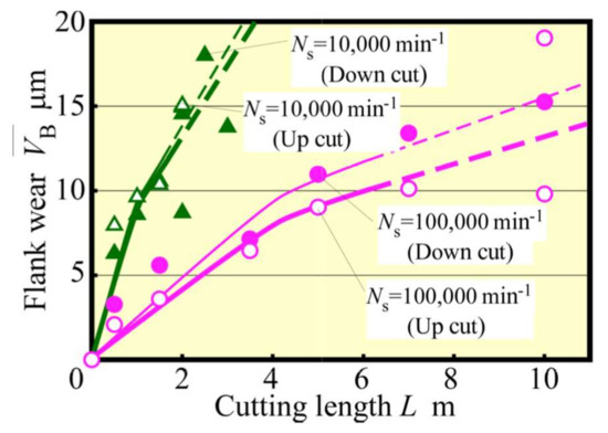 Relationship between flank wear and cutting length (Up cut, Ns = 100,000 min−1).