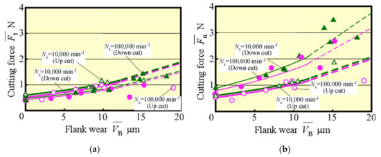 Relationship between cutting force and flank wear (Up cut, Ns = 100,000 min−1) (a) Normal cutting force (b) Tangential cutting force.