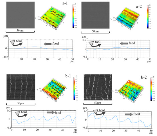 SEM images, 3D images, and profile curves of the machined surface (a-1) Up cut, L = 1.5 m (a-2) Up cut, L = 7.0 m (b-1) Down cut, L = 1.5 m (b-2) Down cut, L = 7.0 m (Ns = 100,000 min−1, f = 5 μm/tooth).