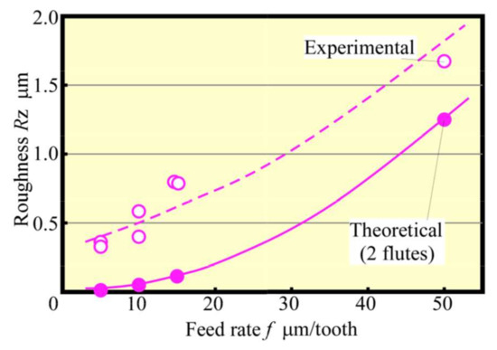 Figure 8 shows that the change in the average cutting force with f was varied at 5–50 μm/tooth at the early stage of the cutting process. It could be seen that the average cutting force increased with the feed rate, although they were not proportional to each other, which contradicts the almost proportional relationship between the maximum geometric depth of cut (maximum chip thickness ) and f, as depicted in Figure 9. From Figure 9, the increase rate was large when f was 15 μm/tooth or less; when f was small, the ratio of the radius of curvature of the tool edge to the depth of cut was large, resulting in poor cutting ability, whereas the average cutting force seemingly changed. Figure 10 shows the relationship between f and the machined surface roughness. The experimental value of machined surface roughness was approximately 0.5 μm greater than the theoretical value , expressed by Equation (1):
