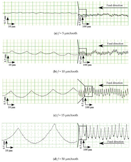 Figure 11 shows the roughness curve of the machined surface for each feed rate. The entire roughness curve shows waviness, and this seemed to have a large effect on the experimental values of surface roughness. However, zooming in the curve would display tool marks (cusps). For example, in the cutting range of one tool revolution, two tool marks remained at f = 50 μm/tooth, whereas only one remained at f = 5–15 μm/tooth. Table 2 shows the results of for each feed rate obtained using Equation (1) and the value of f when the feed rate was 2f per tool revolution (assuming a tool mark was generated with one cutting edge). Please note that when the feed rate was small, such as f = 5–15 µm/tooth, a feed rate of 2f at the theoretical roughness was closer to the experimental value. Although in the experiments the static runout of the tool was kept below 1 μm, the high-frequency component of the roughness curve was in sub-micrometer. The tool runout must be smaller than runout of the tool to produce a machined surface with a two-flute cutting surface. A discussion in terms of dynamic runout is necessary to elaborate on this condition. However, because it is almost practically impossible for the runout of the tool to become zero, the generation of a machined surface at a small feed rate per tooth could have suggestively been because only one cutting surface remains, even for a multi-flute tool.
