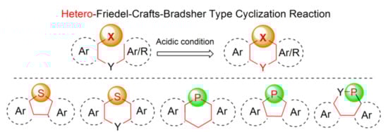 Among various general methods for the synthesis of arenes and heteroarenes, the Bradsher cyclization (1940), which is the intramolecular version of the discovered earlier Friedel-Crafts acylation and alkylation reactions (in 1877), realizes the most common ring closure strategy. From the mechanistic point of view, this reaction is categorized as the electrophilic aromatic substitution SEAr, in which a carbocation σ complex (arenium ion) is formed as an intermediate. Nearly all organic compounds of electrophilic character may react with (hetero)aromatics in this reaction under suitable activation conditions. It is also known that heteroatom cations generated from p-block-elements including phosphorus and sulfur may also interact with (hetero)arenes to form heteroarenium species and thus enable introduction of ring heteroatoms in place of carbon atoms. This type of modification, which may be referred as a hetero-Friedel-Crafts-Bradsher reaction, is a useful tool for incorporation of heteroatoms into π-conjugated frameworks. Our intention was to summarize, in this review, all synthetic approaches based on mechanistic principles of this reaction leading to five- and six-membered cyclic products via the heteroatom–carbon bond formation. An integral part of this work is a review of properties and applications of the synthesized molecules, which is placed in the end of each subsection. Lack of information means that only synthesis of a new molecule or a group of molecules has been developed. Most of the data, especially in case of thiophene-based materials, concerns opto-electric properties due to the unique structures of the obtained molecules containing considerable unsaturation in addition to phosphorus and sulfur, accompanied by other ring heteroatoms, like oxygen and nitrogen (Scheme 1). Some selected examples of the hetero-Friedel-Crafts-Bradsher cyclization may be found in earlier literature [,].