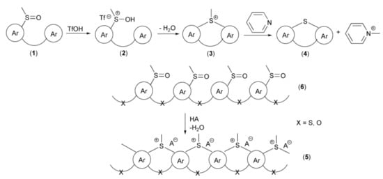 One of the most efficient key approaches for the synthesis of polycyclic systems containing ring sulfur atom and utilizing intramolecular electrophilic annulation reaction of sulfoxide groups in alkylsulfinylarenes with aromatic rings was introduced by Müllen and coworkers in 1999. The mechanism of this transformation assumed protonation of oxygen atom in the sulfoxide group (1), in the presence of trifluoromethanesulfonic acid (triflic acid, TfOH) with formation of electrophilic sulfonium cation (2). Thus, this acidic activation of sulfoxide resembles activation of carbonyl group in the presence of Brönsted or Lewis acids in SEAr reactions. In the next step, the sulfonium cation (2) underwent intramolecular, electrophilic substitution reactions followed by elimination of water, to give cyclic methylsulfonium salt (3). In the last step, a base, usually pyridine, promoted demethylation to provide the derivative (4). The above strategy was utilized in syntheses of not only “small molecules” but also polymeric systems (5) starting from polysulfoxides (6) as substrates (Scheme 2).