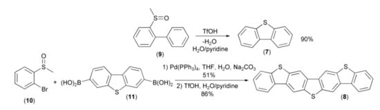The first illustration of this new methodology was synthesis of dibenzothiophene (7) and dibenzo[b,b’]thieno[2,3-f:5,4-f’]bis[1]benzothiophene (DBTBT, 8) reported by Sirringhaus and coworkers. The syntheses proceeded via the acid-induced intramolecular cyclization reaction of arenes containing methyl sulfoxide groups, i.e., methylsulfinylbiphenyl (9) and 3,7-bis(methylsulfinylophenyl)dibenzothiophene. The latter was prepared through the Suzuki–Miyaura cross-coupling reaction of the bromide (10) and the diboronic acid (11) (Scheme 3) [].