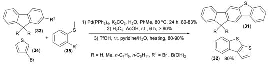 Application of a similar strategy allowed preparation of unsymmetrical fluoreno[2,3-b]benzo[d]thiophene (31) and benzothieno[2,3-b]thiophene (32) from fluorenes (33), 3-bromothiophene (34), and sulfides (35) (Scheme 6). Photophysical properties showed that these compounds can be considered as effective dopant materials for organic emitting diodes [,].