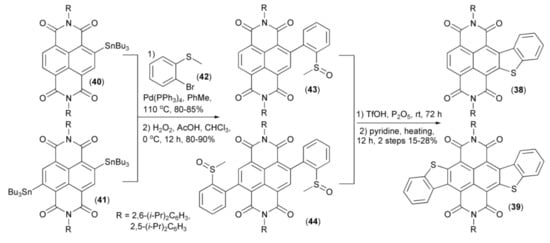 Gao and coworkers employed the Stille coupling for synthesis of benzothiophene-fused naphtalenodiimides (38) and (39) from 2- and 2,6-substituted tin derivatives (40) and (41), respectively. The latter was first reacted with 2-bromothioanizole (42) and then oxidized with hydrogen peroxide to give sulfoxides (43) and (44), respectively, and finally cyclized to the desired products (38) and (39) in the presence of triflic acid (TfOH)/phosphorus pentoxide (Scheme 8) [].