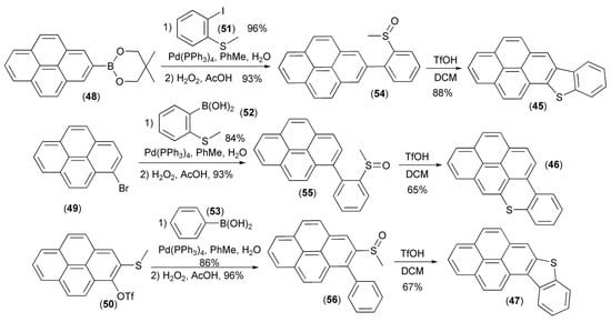 Three approaches to the synthesis of new pyrene fused thienoacenes (45–47) were realized by Li and coworkers. The approaches utilized a coupling of pyrene derivatives (48–50) with 2-iodothioanisol (51) or boronic acids (52)/(53), and subsequent oxidation to afford sulfoxides (54–56), which in the final step underwent cyclization to regioisomeric [,]-, [,]-, and [,]-pyrenes (45–47) in the presence of triflic acid (TfOH) (Scheme 9) [].