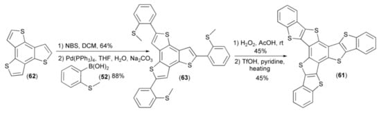 Based on the described methodology, Hu and coworkers synthesized benzo[1,2-b:3,4-b’:5,6-b’’]-tri(benzo[4′,5′]thieno[2′,3′-d’]thiophene) (61) starting from symmetrical benzo[1,2-b:3,4-b’:5,6-b’’]-trithiophene (62). Bromination of (62) followed by coupling with boronic acid (52) afforded the trisulfide (63). Oxidation of the latter in the next step and cyclization in the presence of triflic acid (TfOH) provided polycyclic heteroacene system (61) in 45% yield (Scheme 11) [].