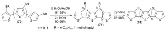 Tuschida and coworkers synthesized a new type of polythiophene oligomers (69) by the cyclization reaction of bithienyls or terthienyls (70) to sulfonium derivatives (71) followed by aromatization with pyridine to give fused thieno-systems (69) (Scheme 13) [].