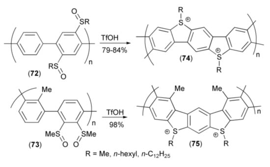 Intramolecular ring closing reaction of alkylsulfinyl-polypara(phenylenes) (72, 73) in the presence of triflic acid (TfOH) provided polymers (74, 75) possessing ionic character (Scheme 14) [,].
