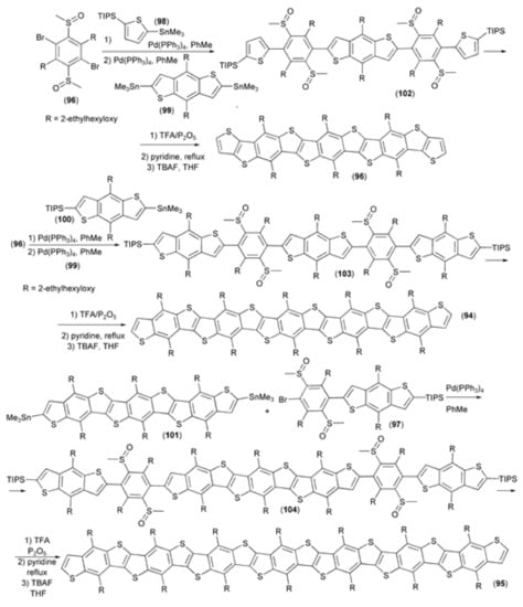 A series of soluble ladder-type thienoacenes (93–95) based on benzo[1,2-b:4,5-b′]dithiophene (BDT) skeleton were synthesized and characterized as p-type semiconductors with wide band gaps. The synthetic strategy, which delivered derivatives (93–95), included two key steps: the cross-coupling of bis(dimethylsulfinyl) benzene (96, 97) with derivatives (98–101) and the multi-ring closing reaction of polysulfinyl benzothiophene derivatives (102–104) catalyzed by the trifluoroacetic acid (TFA)/P2O5 reagent system (Scheme 18). Due to the high conjugation length, synthesized oligomers (93–95) showed high emission and quantum yields. Moreover, they were found to be good two-photon absorbers, exhibiting high two-photon absorption coefficients [].