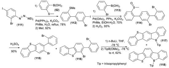 The Pd-catalyzed Suzuki–Miyaura coupling reaction of the aryl iodide (111) with 2-thioanisylboronic acid (50) followed by a subsequent methylation/iodination of the triazeno group in the resulting intermediate, afforded the biphenyl derivative (112). The repeated Suzuki–Miyaura coupling of (112) with 2-bromophenylboronic acid (113) followed by oxidation of the resulting product with H2O2, delivered the sulfoxide (114), which, after the ring-closing condensation with concentrated sulfuric acid, gave a mixture of dibenzothiophene regioisomeric derivatives (115) and (116). The dilithiation of this mixture with n-butyllithium followed by quenching with 2,4,6-triisopropylphenylboronic acid methyl ester (TipB(OMe)2) produced a mixture of isomeric linear heteroacenes (117) and (118). These new ladder-type molecules were highly emissive in both solution and solid state and displayed reversible reduction waves in cyclic voltammograms (Scheme 20) [].