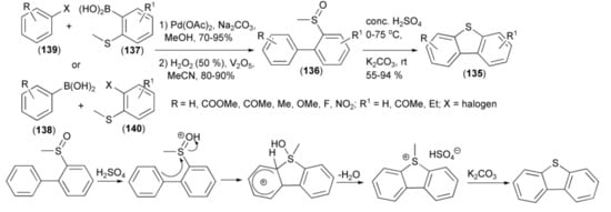 The synthesis of unsymmetrical dibenzothiophenes (135) was achieved by an acid-mediated ring closure of the biphenyl (136) having a sulfoxide substituent at the ortho-position. The latter was synthesized in the Suzuki coupling reaction of boronic acids (137, 138) with substituted halobenzenes (139, 140) followed by oxidation with hydrogen peroxide (Scheme 23) [].