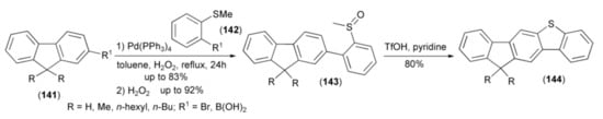 The Suzuki–Miyaura cross-coupling reaction between 9,9-dimethyl-2-fluorene derivative (141) and 2-substituted methylthiobenzene (142) produced after oxidation of sulfur atom with hydrogen peroxide the methyl sulfoxide derivative (143) in 80% yield. The acid-induced condensation of the latter and subsequent demethylation in the presence of water/pyridine afforded unsymmetrical, fused compounds (144). The di-n-hexyl substituted derivative (144) exhibited intense fluorescence in solution with the highest quantum yield of up to 91%. Moreover, the solution-processed, green phosphorescent, organic light-emitting diodes with this derivative as the host material exhibited a maximum brightness of 14,185 cdm−2 and a luminescence efficiency of 12 cdA−1 (Scheme 24) [].