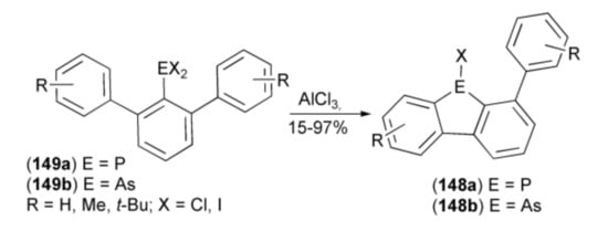 The AlCl3-catalyzed, intramolecular phospha- and arsa-Friedel-Crafts-Bradsher ring-closure reactions were realized by Wehmschulte and coworkers. They synthesized unsymmetrical 9-chloro-9-phosphafluorenes (dibenzophospholes) (148a, E = P) and closely related 9-chloro-9-arsafluorenes (dibenzoarsoles) (148b, R = As), starting from m-terphenyldichlorophosphines (149a) and the corresponding arsines (149b) (Scheme 26) [,].