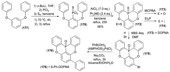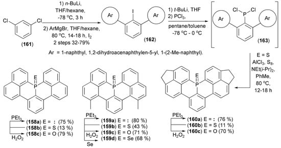 Nakamura and coworkers realized a synthesis of phosphaperylenes (158–160) starting from 1,3-dichlorobenzene (161). The synthesis involved 1) lithiation at the 2 position in (161), 2) subsequent Cl/Ar replacement with Grignard aryl reagents and 3) iodination to deliver teraryls (162), and 4) the iodine/lithium replacement in (162) followed by phosphinylation with phosphorus trichloride to give the substrate (163) for the electrophilic tandem ring-closure in the presence of AlCl3/S8/NEt(i-Pr)2 to afford phosphaperylenes (158–160b, E = S). Other phosphaperylenes (158–160a, E = electron pair) were obtained by desulfurization of the latter with triethylphosphine. The corresponding phosphine oxides (158–160c, E = O) were synthesized by treatment of the corresponding phosphine sulfides and phosphine selenides (159d, E = Se) with H2O2 (Scheme 29) [].
