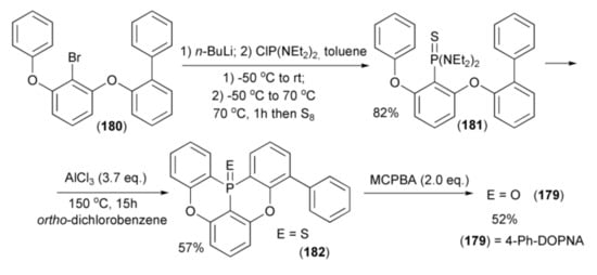 - Ito, T.; Iwai, T.; Nakai, T.; Mihara, M.; Mizuno, T.; Ohno, T.; Ishikawa, A.; Kobayashi, J.-I. Superacid-catalyzed Friedel–Crafts phosphination of 2-hydroxybiphenyls with phosphorus trichloride. Heteroat. Chem. 2016, 27, 336–342. [Google Scholar] [CrossRef]