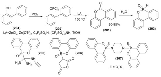 The synthesis of P-chloro-oxaphosphorinane (201) usually proceeds via the phospha-Friedel-Craft-Bradsher cyclization of the phosphorus dichloride (202) in the presence of Lewis acid at very high temperature. The P–Cl bond in (201) was next hydrolyzed to H-phospinate (203). In this approach, the substrate (205) was obtained from condensation of 2-hydroxybiphenyl (204) with phosphorus trichloride. Later, Pastor et al. and Holmes et al. carried out the same reaction without a solvent using a weaker Lewis acid (ZnCl2) at 200 °C [,].