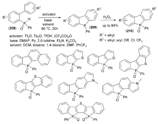 Hirano and Miura presented an application of the Tf2O-mediated phospha-Friedel-Crafts-Bradsher cyclization in the synthesis of dibenzophospholes. Secondary biarylphosphine oxides (208) underwent tautomerization to the corresponding hydroxyphosphines. Their OH group was activated with Tf2O to deliver an electrophilic phosphorus center which could be readily trapped with the proximal aromatic ring to give (209). Oxidation of (209) with H2O2 afforded a family of dibenzophosphole oxide (210) (Scheme 37) [].