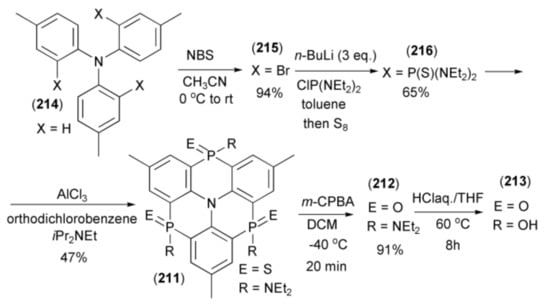 The Hatakeyama group reported synthesis of triphosphaazatriangulenes (211–213) through triple phospha-Friedel-Crafts-Bradsher cyclization []. The triangulene (213) was synthesized in five steps starting from tri-p-tolylamine (214), which was brominated with N-bromosuccinimide (NBS) to give the corresponding tribromide (215). Triaryllithium, generated from (215) by n-butyllithium, was trapped with excess of bis(N,N-diethylamino)chlorophosphine (ClP(NEt2)2) and submitted to sulfurization with elemental sulfur to afford the intermediate tris(thioamide) (216). The triple cyclization of (216) with Hünig’s base in the presence of AlCl3, at elevated temperature, afforded triphosphaazatriangulene (211) (Scheme 38). Oxidation of the latter with MCPBA and hydrolysis by HClaq. in THF, gave the corresponding triangulenes (212) and (213).