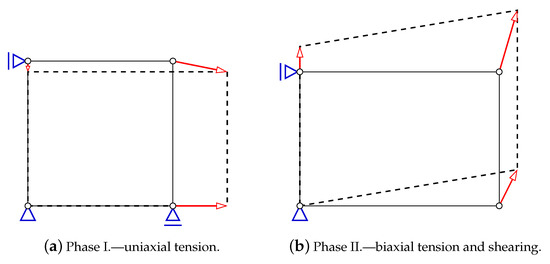 - Uniaxial horizontal tension with vertical contraction due to the Poisson’s effect, according to the relation between the strain increments:where and are horizontal and vertical strain components, respectively, is shear strain and is Poisson’s ratio. In Figure 1a, the scheme of prescribed displacements corresponds to the uniaxial tensile strain state. Such relation is valid until the tensile strength is attained.