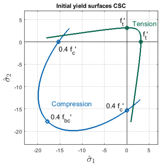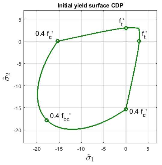 where is the effective Mises equivalent stress, is the effective hydrostatic pressure and is the positive part of the maximum principal effective stress. Parameters , and decide about the shape of the yield surface; however, ABAQUS users define the following strengths for concrete: the uniaxial tensile strength denoted as and , , are maximum uniaxial, initial uniaxial, and initial biaxial strengths for compression, respectively. These coefficients affect parameters , and as well as the yield criterion, so that the shape of can be determined. Its initial form in 2D for the data applied in Willam’s test (see Section 3) is shown in Figure 2. This yield surface has first been introduced in [13]. It matches the experimental data well for concrete in stress states with prevailing tension and dominant hydrostatic compression. There are a few other yield surfaces of similar quality widely used for quasi-brittle materials like concrete, cf. [17,18,19].