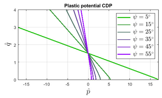 where is the dilatancy angle and the so-called eccentricity decides about the shape of the tip of surface . Figure 3 illustrates the influence of dilatancy angle on function described in the - plane. Different aspects of the dilatancy definition connected with the plastic potential are addressed e.g., by [22]. It should be noticed that both functions and are formulated as modifications of the classical Burzyński–Drucker–Prager (BDP) yield criterion.