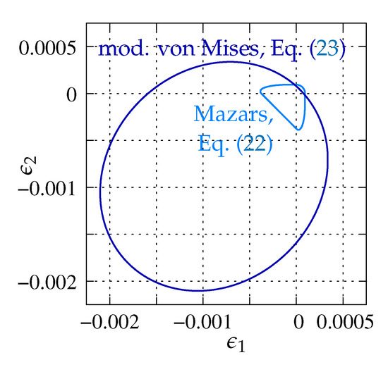 where and are introduced similar to and , but without stress components of associated with open cracks—this way, secondary cracks can form only perpendicular to already existing ones (no more than two cracks perpendicular to each other in 2D case). Relation for uniaxial tension governs softening of the yield surface and parameter influences the shape of the yield surface. In order to control softening of function , the classical formalism of the associated elastoplasticity is introduced with strain rate decomposition:
