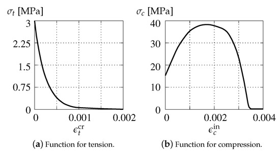 where is the first strain tensor invariant, is the second deviatoric strain invariant, is the Poisson’s ratio and is the ratio between compressive and tensile strength. Both functions are depicted in Figure 6 according to the data used in Willam’s test (see Section 3). The damage growth function directly depends on the damage history parameter and can be determined e.g., as the exponential softening relation. It properly reproduces tensile fracture phenomenon in concrete by the asymptotic function [38]: