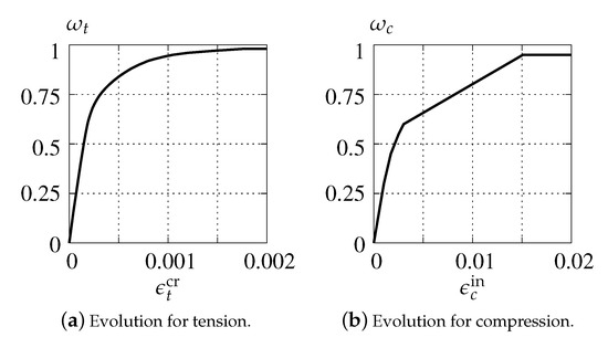 Variable reduces the stiffness in tension and consequently —in compression, while functions and are responsible for stiffness recovery. A wider discussion of the damage definition in the CDP model and of the crack closing phenomenon can be found in [23].