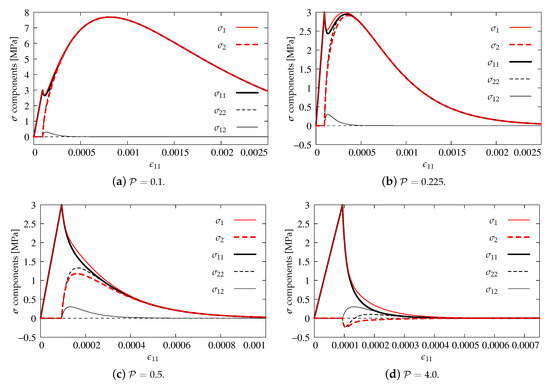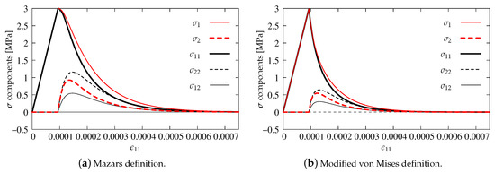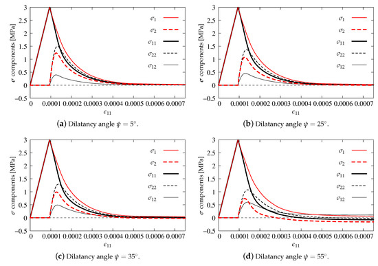 Again, in this subsection, axial strain–stress component’s diagrams are shown as previously. Figure 14a presents the results for . The volumetric degradation is significantly reduced, so, after the first peak for and MPa and their quick and slight decrease, a second increase of stresses occurs up to value MPa for . After passing this point, all diagrams descend, probably to zero. All components, apart from shear stress which is zeroed, run together. An analogical behavior is observed for the next case depicted in Figure 14b. However, it is found that, for , a second hump is reached when equals MPa, since the uniaxial tensile strength is not exceeded and the first condition of Willam’s test is passed. The second condition is also fulfilled, because the stresses approach zero. The results for cases and illustrated in Figure 14c,d satisfy Willam’s test as well. Increasing power accelerates the process of stiffness degradation due to larger and larger reduction of bulk modulus K. In the case , the steepest slope of the softening path for and is noticed. Negative values of and are manifested, but finally they return to zero. It means that the second condition is always passed, even if quite large values of are introduced. It can therefore be concluded that the IDA model passes Willam’s test only if .
