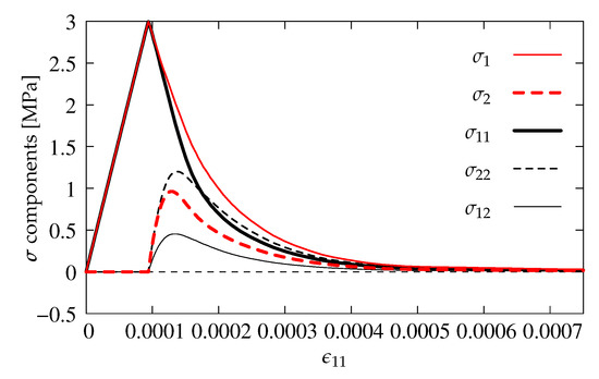- Immediately after the tensile strength is reached, the change of configuration is enforced, Figure 1b. Now, the proportions for the strain increments are arranged in the following way:This relation induces tension in two directions with additional shear effect. As a result of such combination, a rotation of principal strain axes occurs; however, tension regime is preserved. At the beginning, the rate of rotation is fast, but, during the evolution, it goes down gradually.