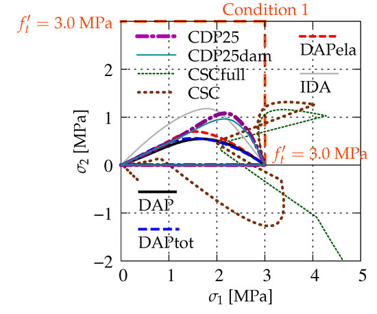 Figure 16 illustrates the evolution of principal stresses in first and fourth quadrants of the principal stress plane, cf. Figure 2 and Figure 5. It is seen that, in phase I, which corresponds to the uniaxial tension, grows from zero to MPa for all cases, while is equal to zero in that stage. In phase II, when softening (cracking) occurs, the values of decrease. At the same time, the values of initially increase, but finally tend to zero. This is observed for all cases except CSCfull and CSC. The values of the principal stress for the CSC model exceed the uniaxial strength . After that, it seems that the stress paths tend to zero, but for about MPa, this process is broken and they shoot up to infinity. For the case CSC, a second return is noticed, but near the origin this curve turns again and finally goes to infinity. The calculations for this case are interrupted. Hence, it is verified once more that the CSC model fails Willam’s test. The maximum values of are obtained for IDA and next for CDP25. It can also be noticed that the differences between CDP25 and CDP25dam as well as DAP, DAPtot, and DAPela are small. The CDP, DAP, and IDA models behave in the principal stress space in a similar way.