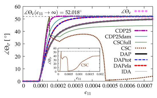 The directions of principal stresses are not constant during the loading process, see also e.g., [2]. After the peak, at the beginning of phase II in Willam’s test, the rotation of principal directions increases fast, then this change slows down and finally tends to the angle with value . The rotation of principal directions can be expressed by evolution of angle for strains and for stresses during the loading process. In Figure 17 for two options DAP and IDA, where the scalar or isotropic damage is employed, the angle of principal directions for stresses and for strains evolves in the same manner, since it is seen that, for pure damage (without any coupling), principal strains and stresses are coaxial. For the coupled version of the DAP model, no matter whether by total strains —case DAPtot or by elastic strains ϵe—case DAPela, the change of angle Θσ is faster than the change of Θϵ. Hence, the coaxiality of principal directions between strain and stress fields can be lost. It should also be noticed for options DAPtot and DAPela that both diagrams overlap and approach the final value 52.018° for the angle of principal directions. The existence of plasticity accelerates the effect of rotation of the principal stresses. It is confirmed for the CDP model as well. For option CDP25, the principal directions for stresses grow very fast and reach the angle with limit value 52.018° for ϵ11 = 0.0002. When the damage component is added in the CDP model, then, for option CDP25dam, this value of angle is achieved for ϵ11 = 0.0003. It seems that the value 52.018° is attained immediately for the CSC model, but next, for both cases CSCfull and CSC, the angle drops to about 35.0°, which corresponds to manifestation of the presence of the primary crack and then is slowly reduced till ϵ11 ≈ 0.00022. After that, the change of the angle depends on whether stronger or weaker shear retention is assumed in the CSC model. For option CSCfull, the value of the angle slowly increases up to about 45.0°. When option CSC is considered, the angle decreases almost to zero and afterwards increases to 40.0° for ϵ11 = 0.002, see the internal subfigure in Figure 17.
