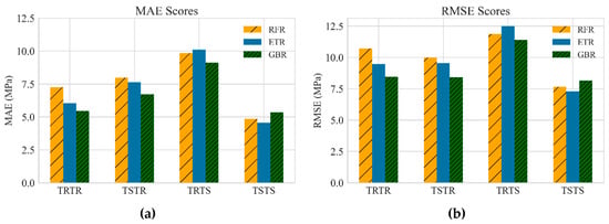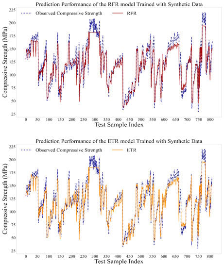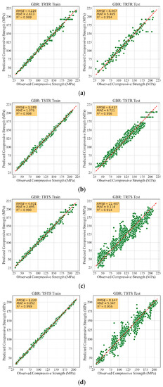 - Statistical metrics of R2 of 0.96 and MAE and RMSE values of 6.72 MPa and 7.41 MPa, respectively, were achieved for the testing set when the GBR model was trained with synthetic data and tested on the entire real data.