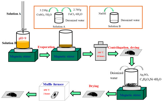 In 200 mL deionized water, 3.210 g CuSO4·5H2O and 2.705 g FeCl3·6H2O were fully dissolved under magnetic stirring; this is marked as solution A. Additionally, a 100 mL NaOH solution was prepared with a final pH of 9; this is marked as solution B. We dropwise added solution A to solution B under magnetic stirring, and we kept the pH of the mixture at 9 from beginning to end by adding 1.0 M NaOH, thus generating a black suspension. Then, the suspension was evaporated and concentrated to 60 mL at 60 °C under magnetic stirring. The 60 mL concentrated suspension was poured into a stainless steel reactor and placed in a 100 °C oven for 10 h. Subsequently, the concentrated suspension was centrifuged and dried to obtain a black powder, which is denoted as powder C. To remove undesired soluble ions such as Na+, SO42− and Cl−, powder C was washed with deionized water and then centrifuged three times; then, precipitate powder C was dried in a 60 °C oven overnight. Then, 0.117 g of Ag2SO4 and 0.031 g of C4H6O4Ni·4H2O were dissolved in 20 mL of deionized water, and all of black powder C was poured in; this is denoted as mixture M. Mixture M was tempestuously stirred at room temperature for 2 h to make powder C fully and uniformly contact Ag+ and Ni2+. Then, mixture M was dried at 60 °C under magnetic stirring until the deionized water completely evaporated. We then put the residual solid mixture M into a muffle furnace for high-temperature calcination in an air atmosphere. The detailed process of sample preparation is shown in Figure 1. Figure S1 shows the MB degradation with the samples calcined at different temperatures. It can be found from Figure S1 that the sample calcined at 650 °C had the best degradation effect of MB, so the calcination temperature of all samples used in this study was 650 °C and the sample was coded as Ag2O-NiO/CuFe2O4. The molar ratio among Ag2O, NiO, and CuFe2O4 was calculated as 3:1:40 in Ag2O-NiO/CuFe2O4. For control experiments, a sample without the addition of Ag2SO4 and C4H6O4Ni·4H2O was also prepared by directly calcining powder C; this is coded as CuFe2O4.