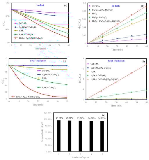 (a) Degradation of methylene blue (MB) with different catalysts in the dark; (b) the pseudo-first-order reaction kinetics for MB degradation with different catalysts in the dark; (c) photocatalytic degradation of MB with different composite photocatalysts under simulated solar irradiation; (d) the pseudo-first-order reaction kinetics for MB degradation with different composite photocatalysts under simulated solar irradiation; (e) percentage decrease in catalytic efficiency of Ag2O-NiO/CuFe2O4 for five cycles. Initial MB concentration: 10 mg/L. Initial H2O2 concentration: 416 mg/L.