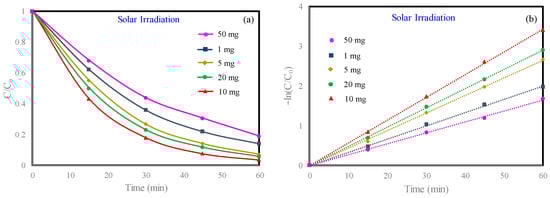 (a) Effect of Ag2O-NiO/CuFe2O4 dosage on MB dye photodegradation; (b) the pseudo-first-order reaction kinetics for MB dye degradation affected by different Ag2O-NiO/CuFe2O4 dosages. Initial MB concentration: 10 mg/L. Initial H2O2 concentration: 416 mg/L.