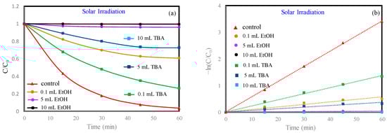 The impact of different ·OH quenchers on MB removal in a photocatalytic system. (a) MB degradation with different quenchers; (b) the pseudo-first-order reaction kinetics for MB degradation with different quenchers. Initial MB concentration: 10 mg/L. Initial H2O2 concentration: 416 mg/L.