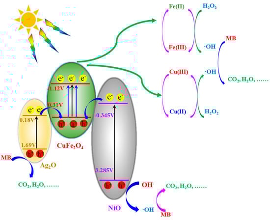 Because the number of photoelectrons produced by CuFe2O4 is very limited and the Fe(III) and Cu(III) cannot be reduced in time, the photo-Fenton degradation effect of MB by the pristine CuFe2O4 reaction was very poor. Ag2O and NiO were able to promote the transition of photoelectrons in the ternary catalyst, as shown in Figure 8. The electrons in the valence band could jump into the conduction band under the sunlight excitation in Ag2O and NiO. Then, these photo-induced electrons could jump into the valence band of CuFe2O4 via a heterogeneous structure, thus promoting the effective reduction for Fe(III) and Cu(III) in CuFe2O4 and further improving the photo-Fenton efficiency. In addition, the photo-induced hole in Ag2O could also directly oxidatively degrade MB. Meanwhile, the photo-induced hole in NiO could oxidize OH− or H2O to produce OH for MB degradation [35].