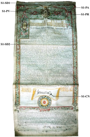 Document S1 (Figure 1) was analyzed by a handheld lens and stereomicroscope, and it has a series of deteriorations and degradations caused by careless handling and use, such as fine tears and frays caused by hydrolytic embrittlement and limited ungluing in the overlap area of the three constituting pieces of parchment caused by cornification processes through chemical or thermal denaturation, particularly in the top area. Regarding the writing and miniatures, document S1 presents fine erosions (thinning of the layers) and exfoliations of the writing and miniature inks caused by fluctuations of the microclimate parameters beyond the optimal values (18–22 °C for temperature, 50 lx for illumination, and 50–60% for atmospheric humidity). Pollution, illumination, and atmospheric humidity turned the originally white parchment to yellow-gray, as seen on both the front and back side of the document, particularly the top area of the document, since that was the most exposed part.