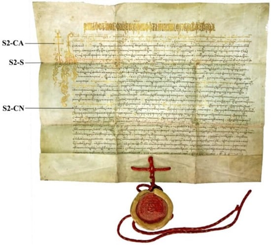 The second document, indexed as S2 (Figure 2), is an original Slavonic parchment, with a hanging seal, containing the charter of Constantin Moghilă, the Prince of Moldavia, reconfirming the rights and privileges of the Secu Monastery. The document was issued in the year 7117 (1609), on 4 February, in Iasi. The manuscript is rectangular in shape, measuring 63.4 × 57.5 cm, of which 8 cm represent the width of the sleeve (the lower cuff of the document folded at the front, fitted with four rhombic perforations placed at the center, through which the string of the seal runs).